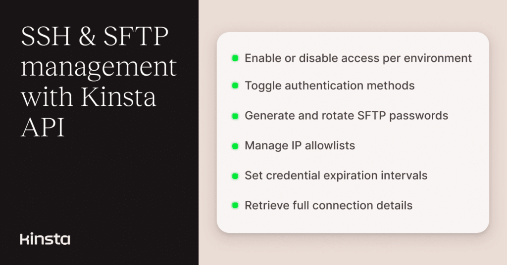 Now, we’re extending those same capabilities to the Kinsta API, expanding on our existing SFTP user management endpoints to give you complete programmatic control over SSH and SFTP access.