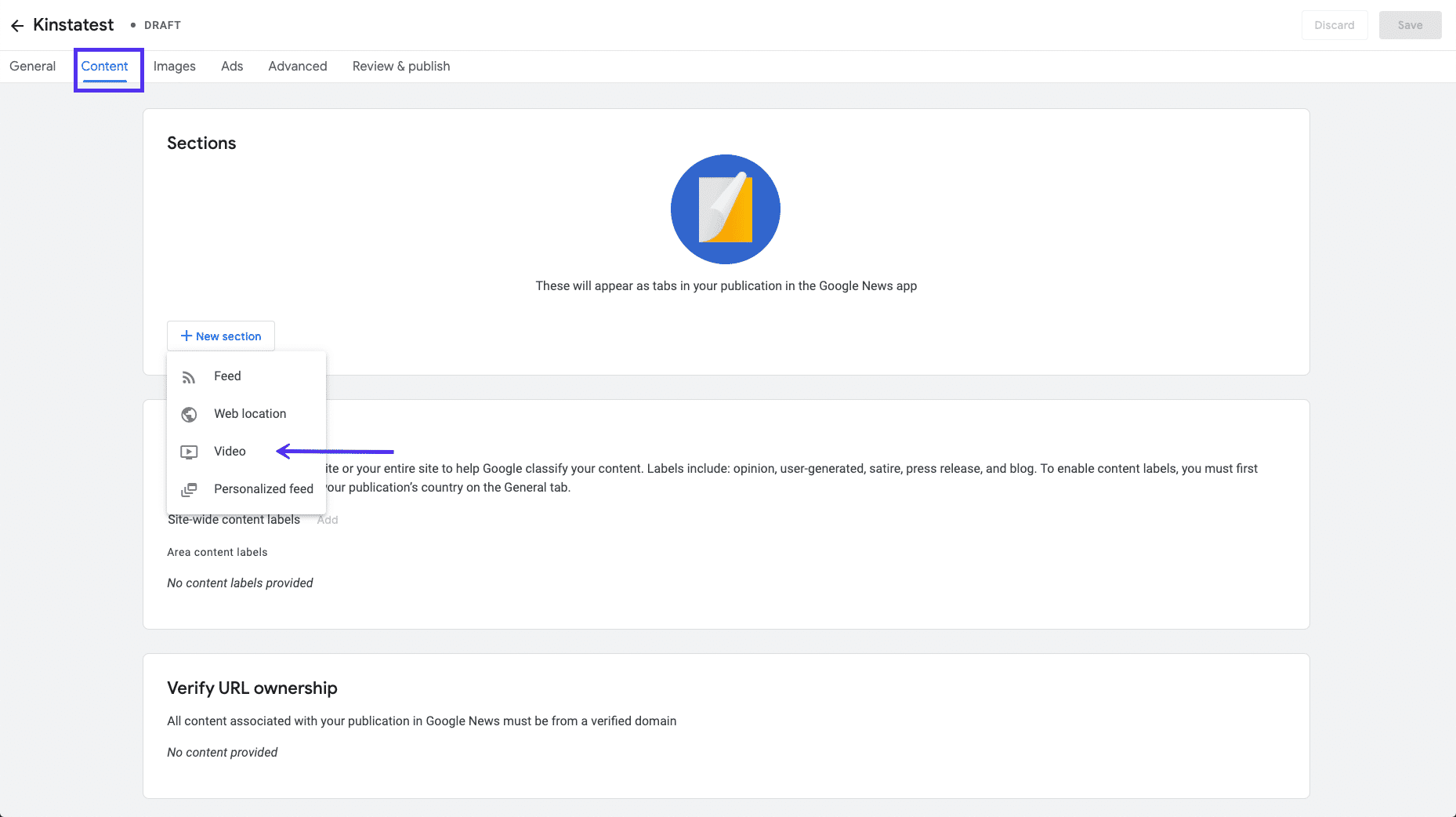 Um deine Videoinhalte bei Google News einzureichen, musst du dich im Publisher Center anmelden und in der oberen Menüleiste auf die Registerkarte Inhalt klicken.