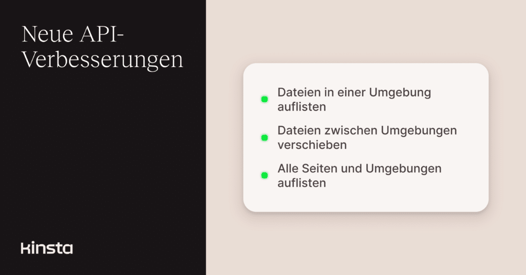 Die Arbeit mit Umgebungen ist jetzt noch einfacher. Dieses Kinsta-API-Update führt neue Möglichkeiten ein, um Dateistrukturdaten abzurufen, selektive Dateipushs zwischen Umgebungen durchzuführen und alle Umgebungen in einer einzigen Anfrage abzurufen, wenn du Websites auflistest.