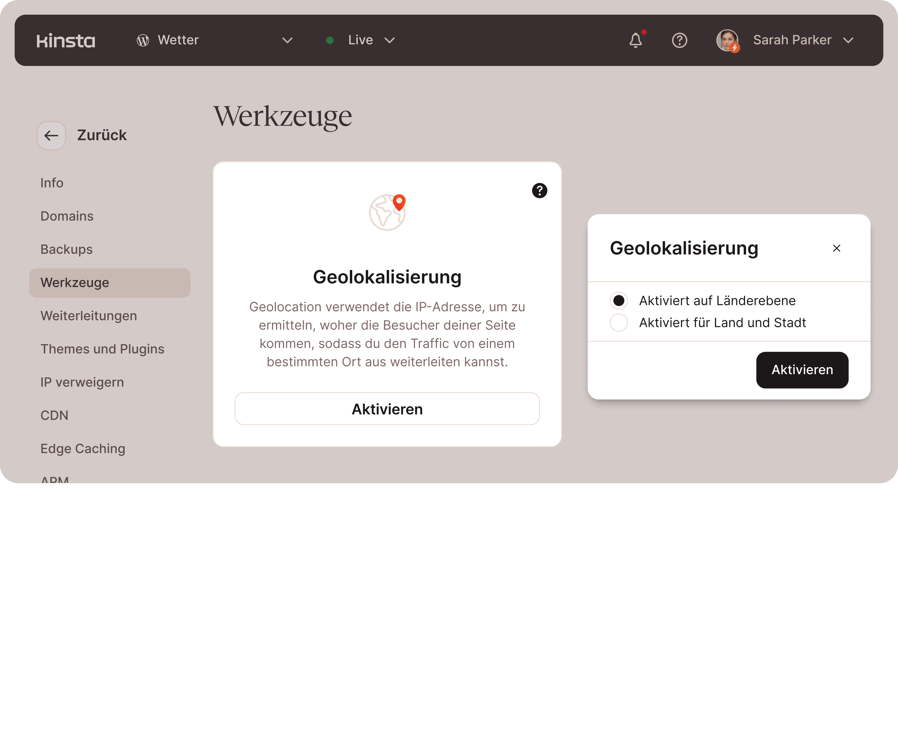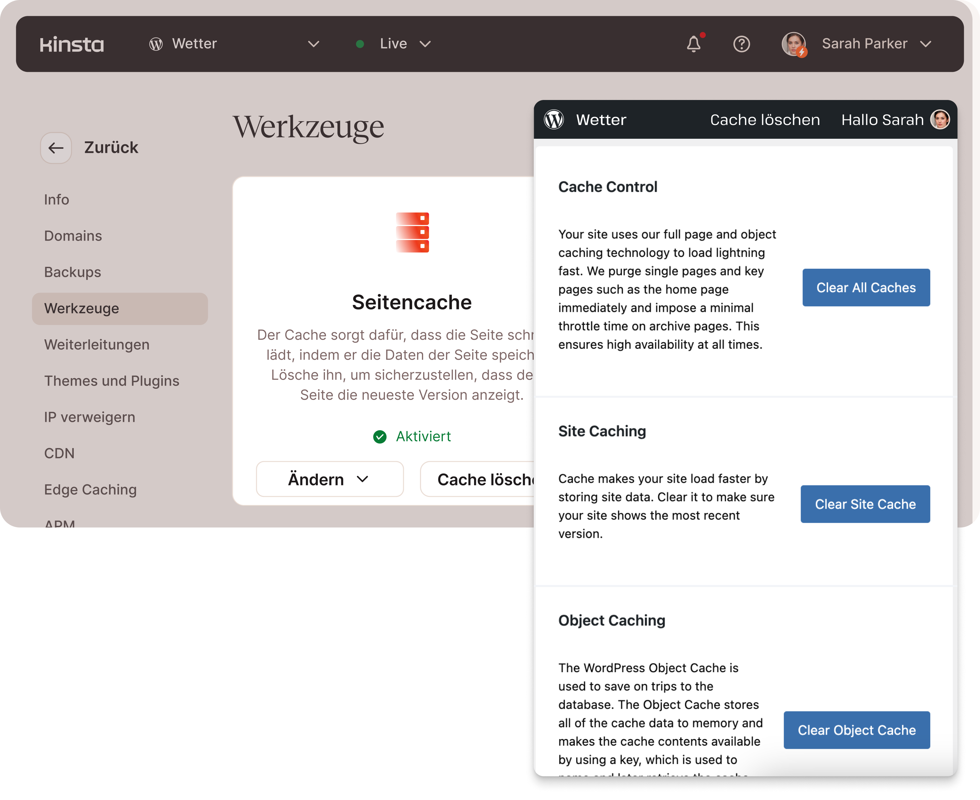Verwalte deine Seite mit MyKinsta und DevKinsta – angepasst an deine Sprache für maximale Benutzerfreundlichkeit.