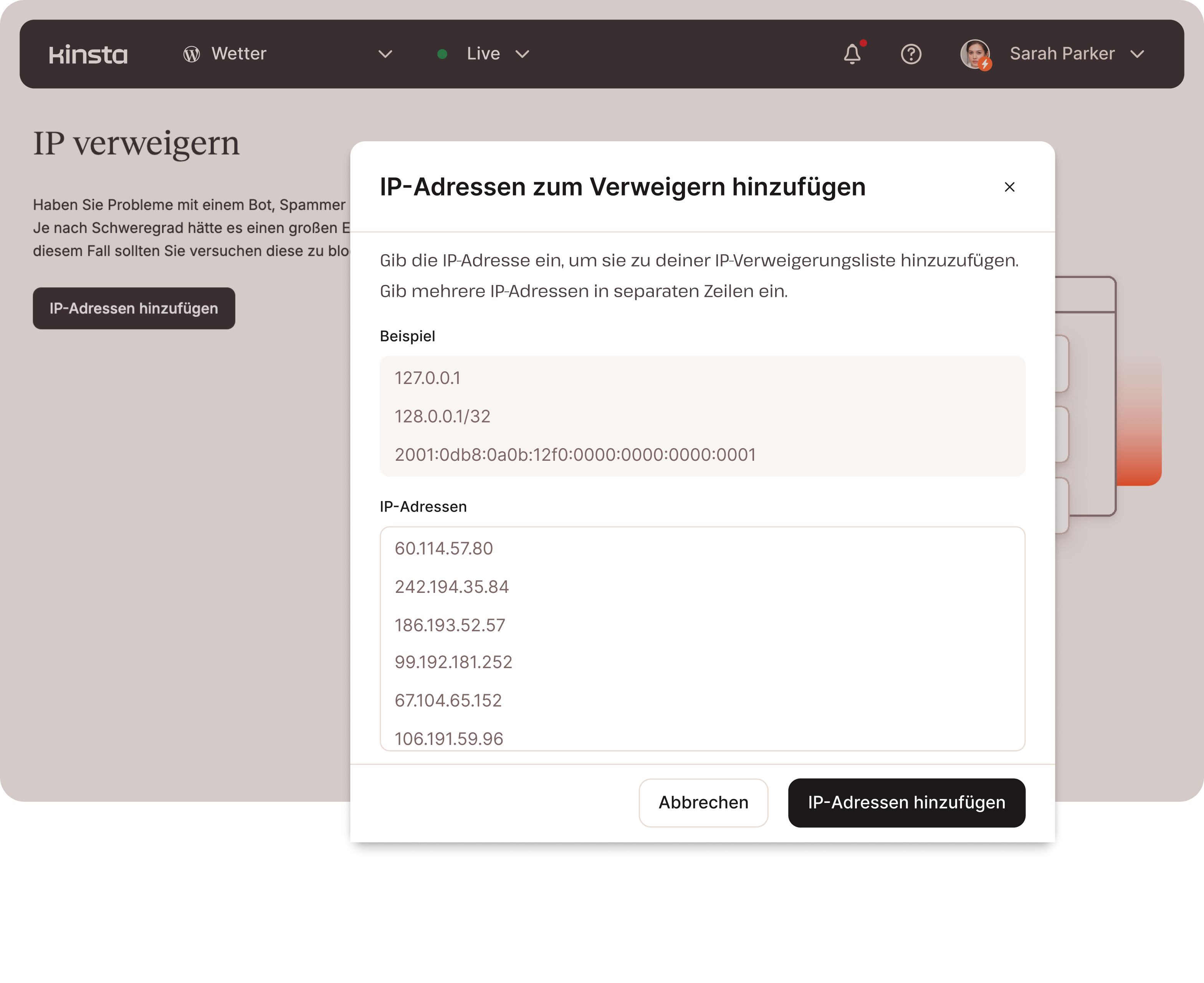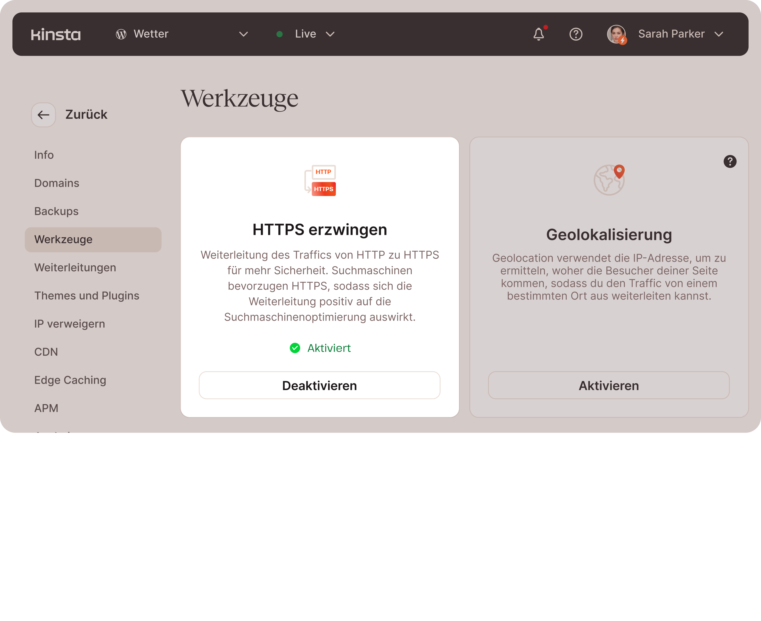 MyKinsta ist das Kontrollzentrum für dein Netzwerk. Verfolge den Datenverkehr, generiere SSL-Zertifikate, konfiguriere Geschwindigkeits- und Sicherheitseinstellungen und vieles mehr. Du bekommst alle Tools, die du brauchst, an einem Ort. Das MyKinsta-Dashboard ist auch auf Deutsch verfügbar.