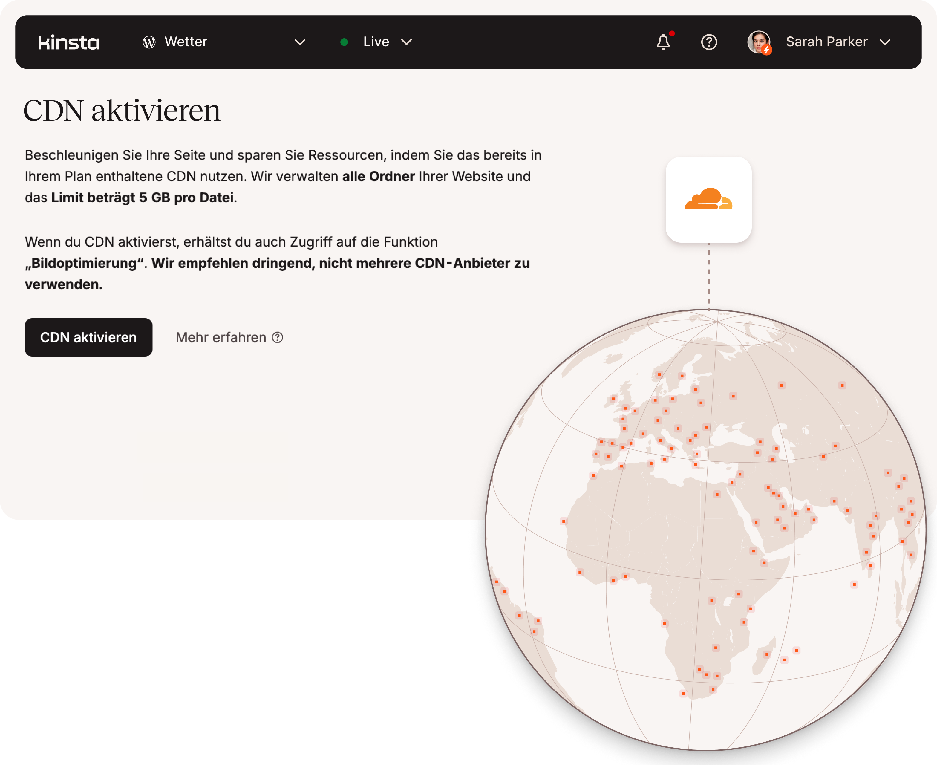 Alle Angebote beinhalten das Kinsta CDN, ein leistungsstarkes Content Delivery Network von Cloudflare mit 300+ POPs, das die Auslieferung deiner Inhalte rund um den Globus beschleunigt. In allen Tarifen ist kostenlose Bandbreite enthalten.