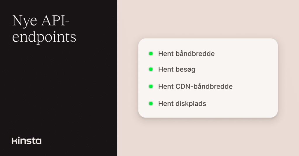 Disse nye analytiske slutpunkter giver udviklere mere synlighed i deres Kinsta-hostede miljøer direkte fra deres automatiserings- og rapporteringsworkflows.