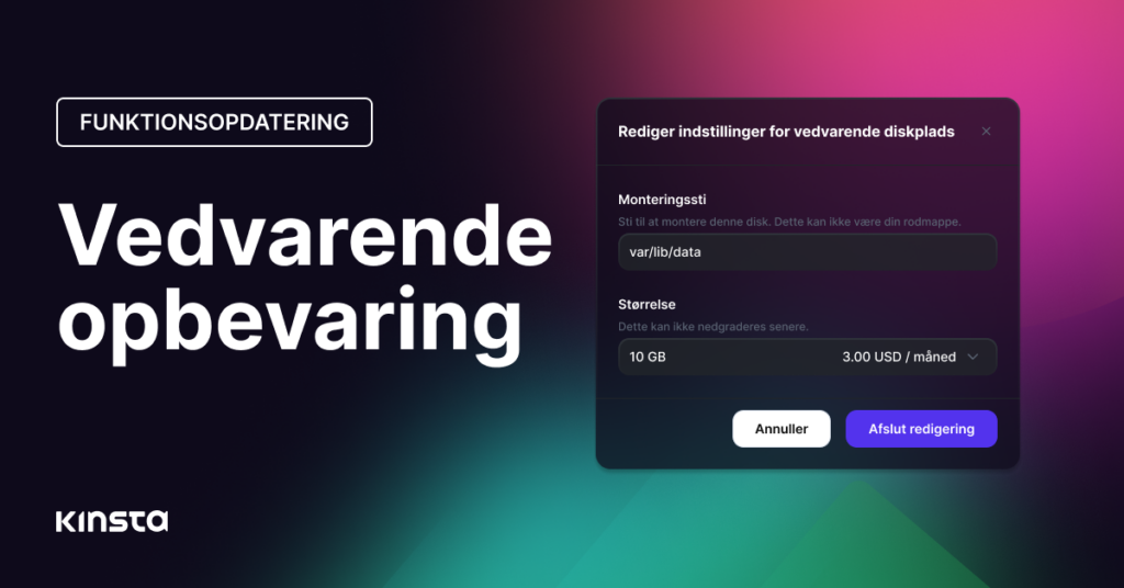 Kinsta Applikation Hosting-kunder har endnu en mulighed for persistent storage (vedvarende datalagring), nu hvor de kan tilføje virtuel diskplads til deres projekter.