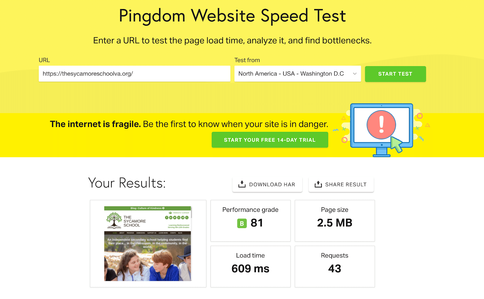 “Det første websted, vi flyttede til Kinsta, var en lille skole. Webstedet var på WP Engine (ikke det firma, der er nævnt ovenfor som et problem). Selvom vi var tilfredse med WP Engine, hævede de deres priser, og Kinstas nonprofit-sats syntes at være et bedre forretningsvalg for os.