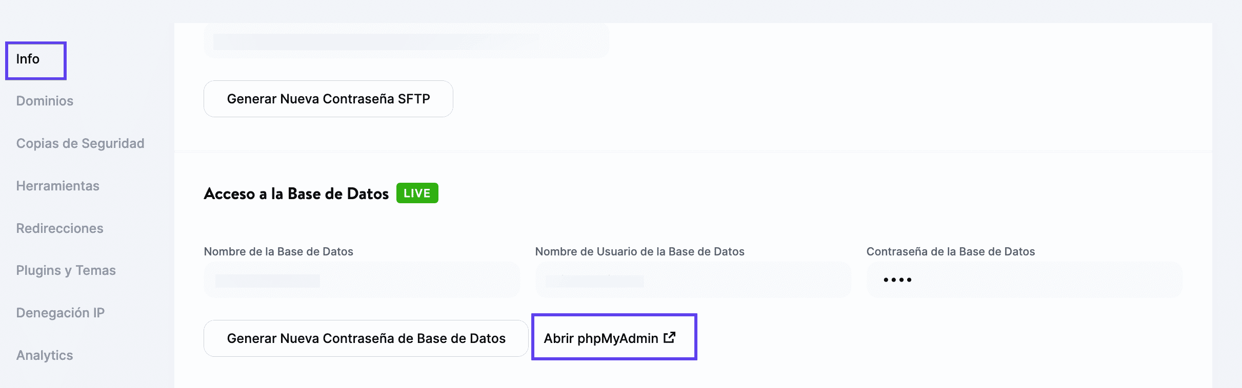 Haz clic en el enlace Abrir phpMyAdmin. Accede al panel de phpMyAdmin con las credenciales de antes (no con tus credenciales de WordPress).
