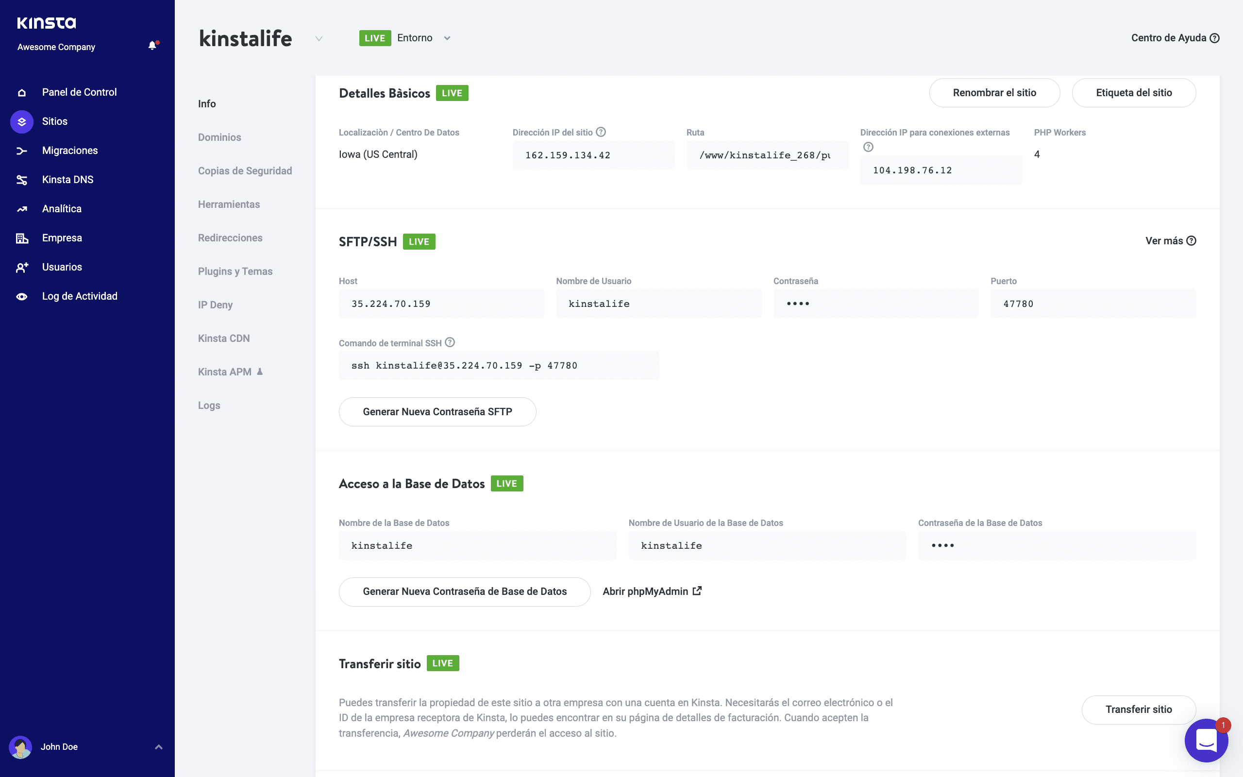 Puedes gestionar todos tus sitios con Kinsta desde esta ubicación central. También tiene mucha información y te ofrece paneles dedicados para las siguientes cosas: