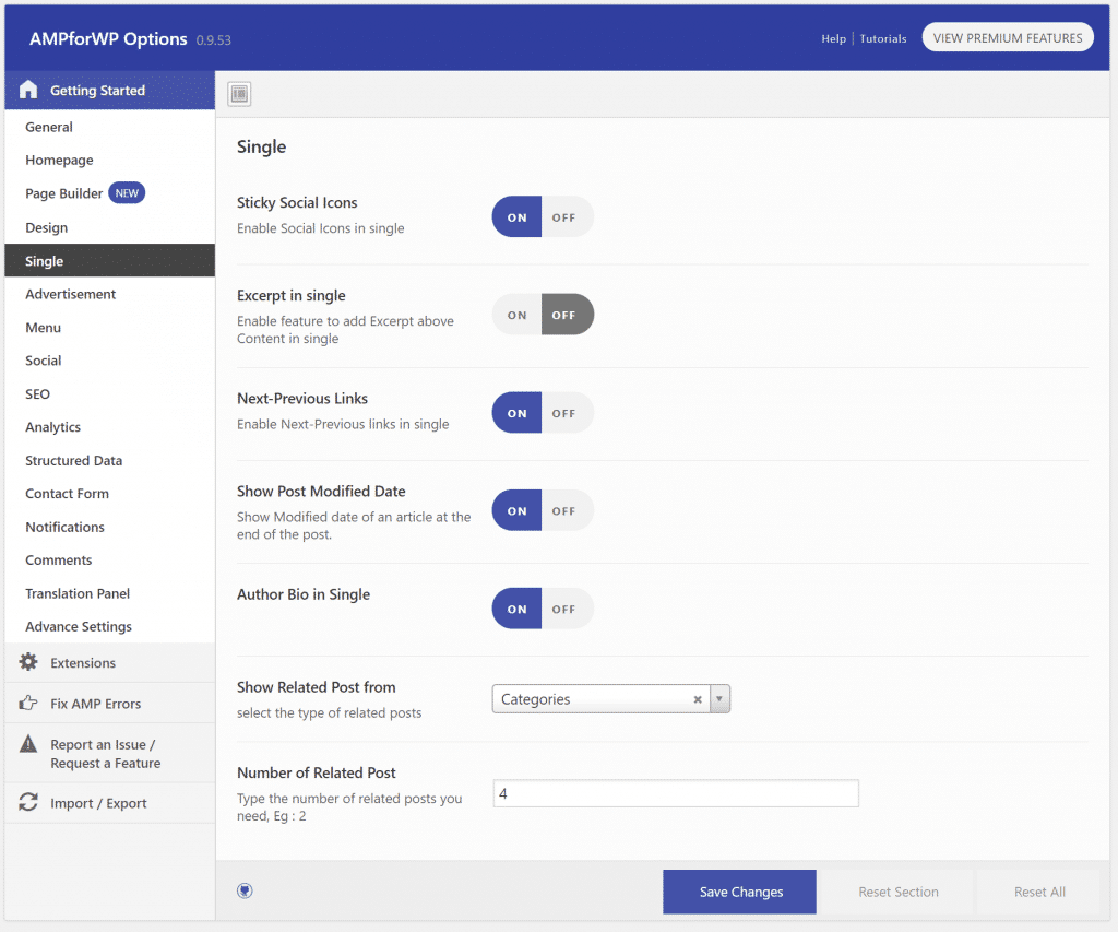 Al momento de escribir esto, actualmente el plugin tiene más de 50,000 instalaciones activas con un 4.6 de 5 estrellas de calificación. Puede descargarlo del repositorio de WordPress o mediante la búsqueda del mismo en el panel de control de WordPress en «Agregar nuevos» plugins. Este complemento le permite personalizar mucho más con su configuración de Google AMP. También hace páginas de apoyo. A continuación, entraremos más en detalle con respecto a las personalizaciones y las funciones disponibles en la configuración de los plugins de AMP en el panel de control.