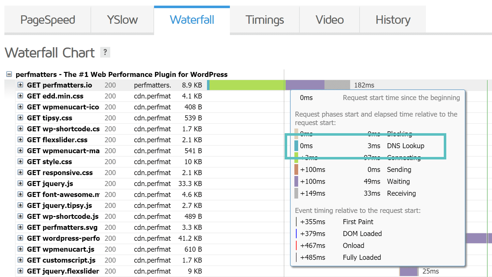 Al ejecutar su sitio web a través de GTmetrix por segunda vez, éste cachea el DNS porque ya sabe la información IP y no tiene que realizar la búsqueda otra vez. Esta es una razón por la que podría notar que su sitio web aparece más rápido después de ejecutarlo a través de GTmetrix herramienta de test de velocidad varias veces. Como se puede ver en la siguiente pantalla, en la 2 ª prueba que ejecutamos, el tiempo de búsqueda de DNS en el DOC de carga inicial es de 0 ms. ¡Esta es una zona que mucha gente mal interpreta! Le recomendamos que ejecute la prueba varias veces y tome la media, a menos que desee DNS como parte de su informe, en cuyo caso puede tomar la primera prueba.