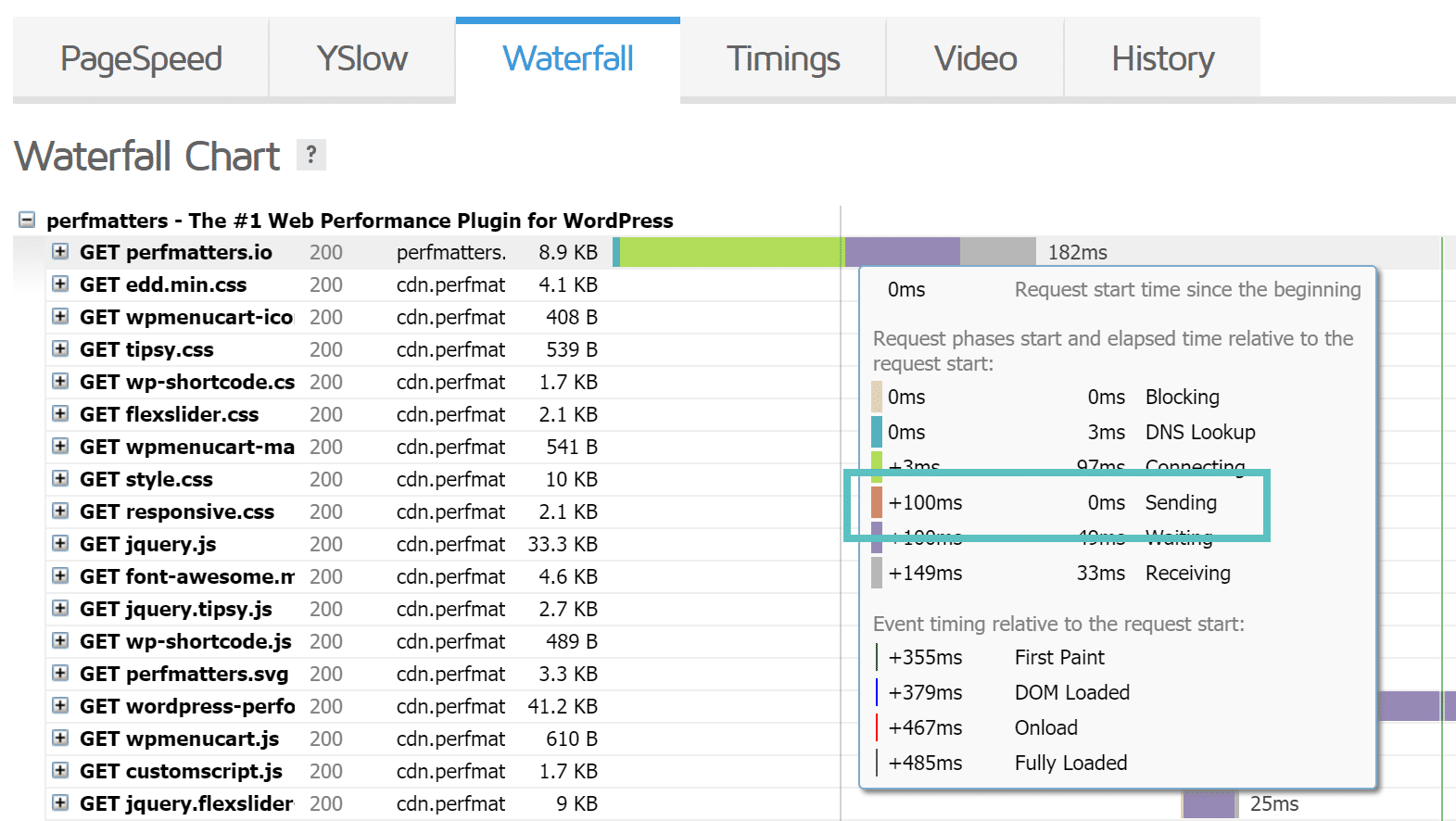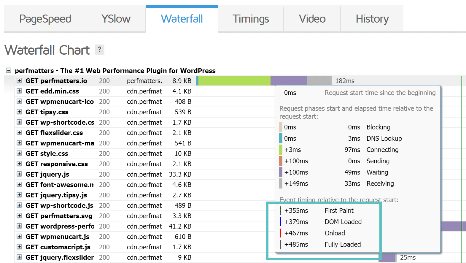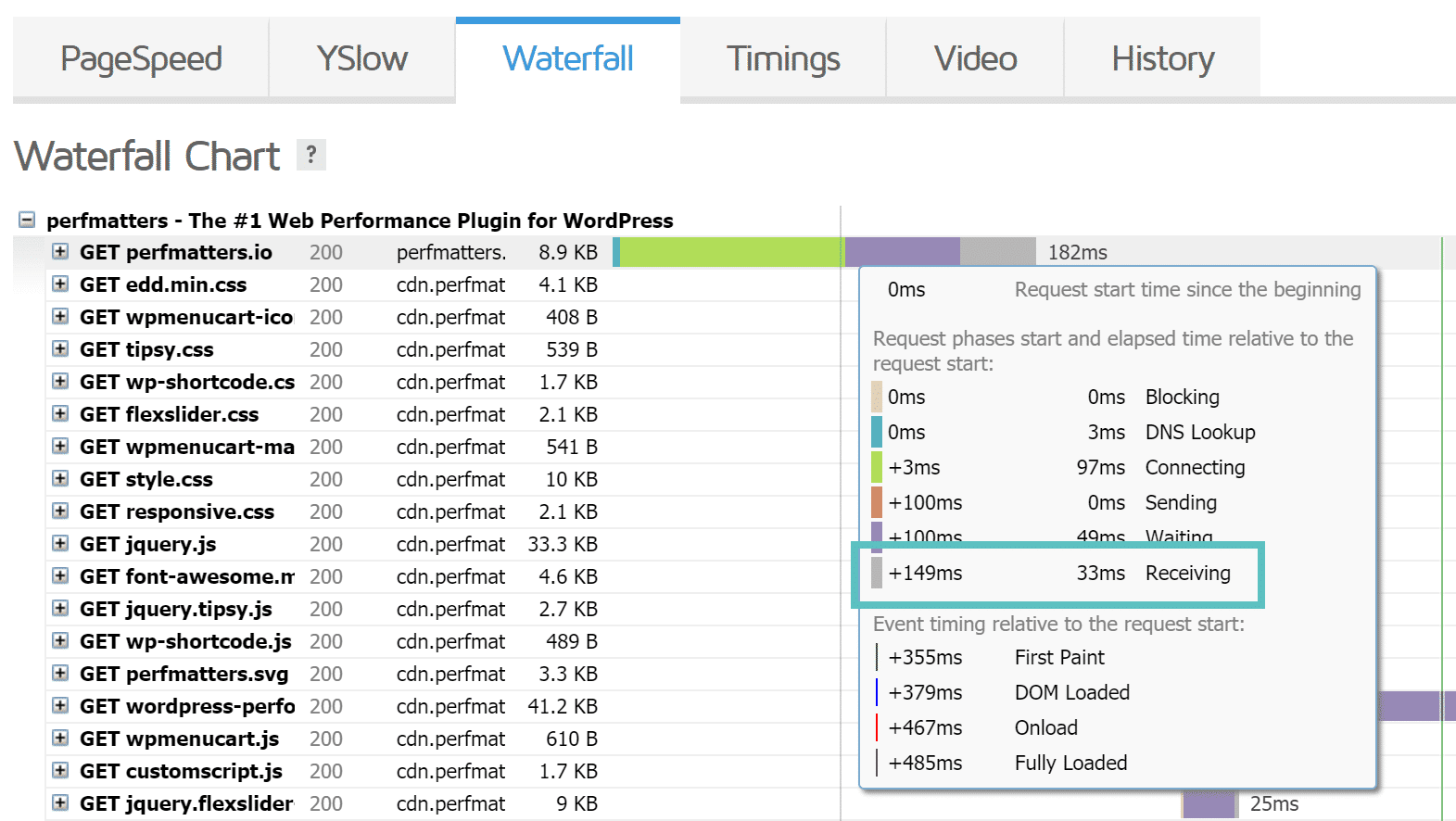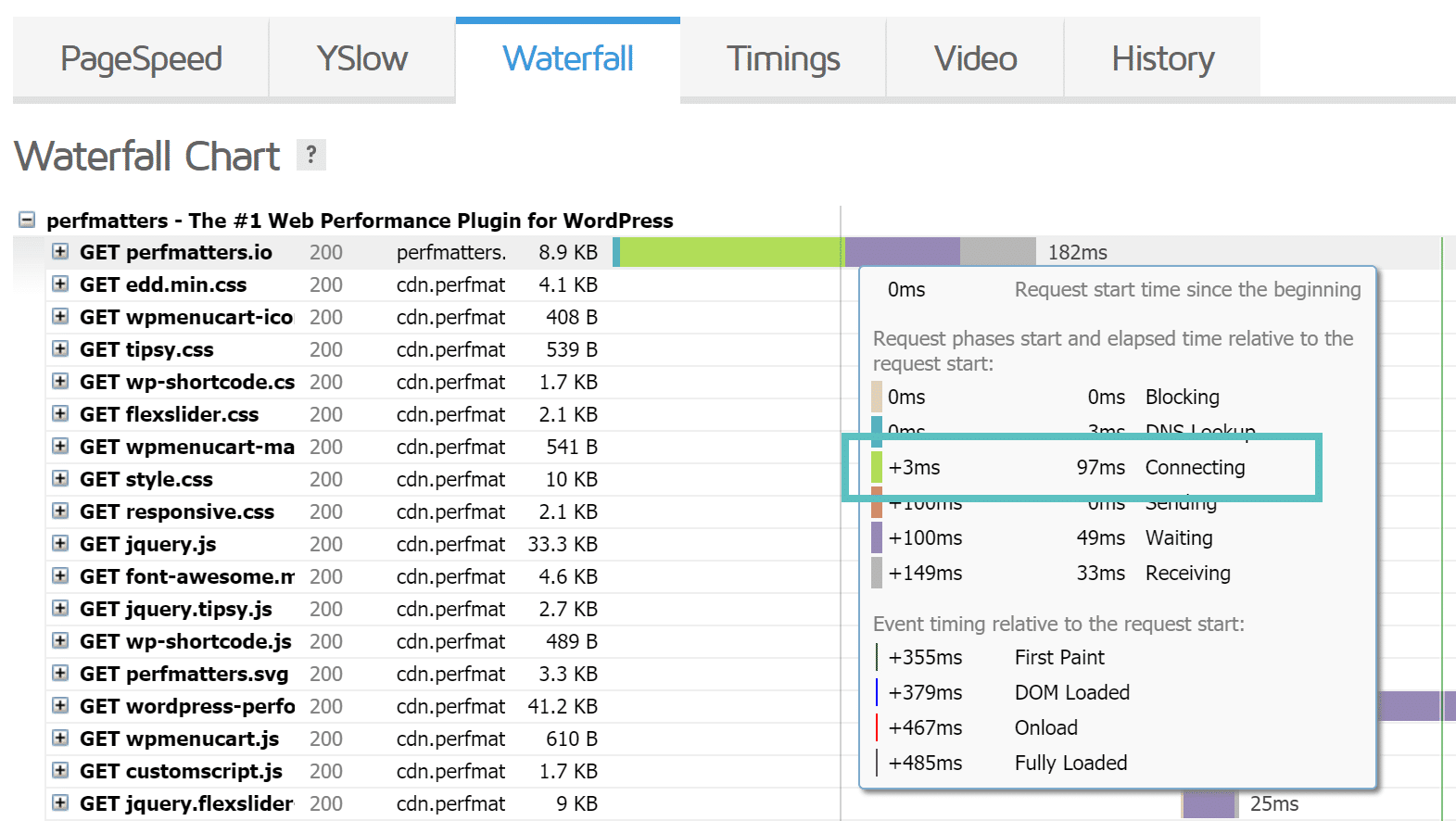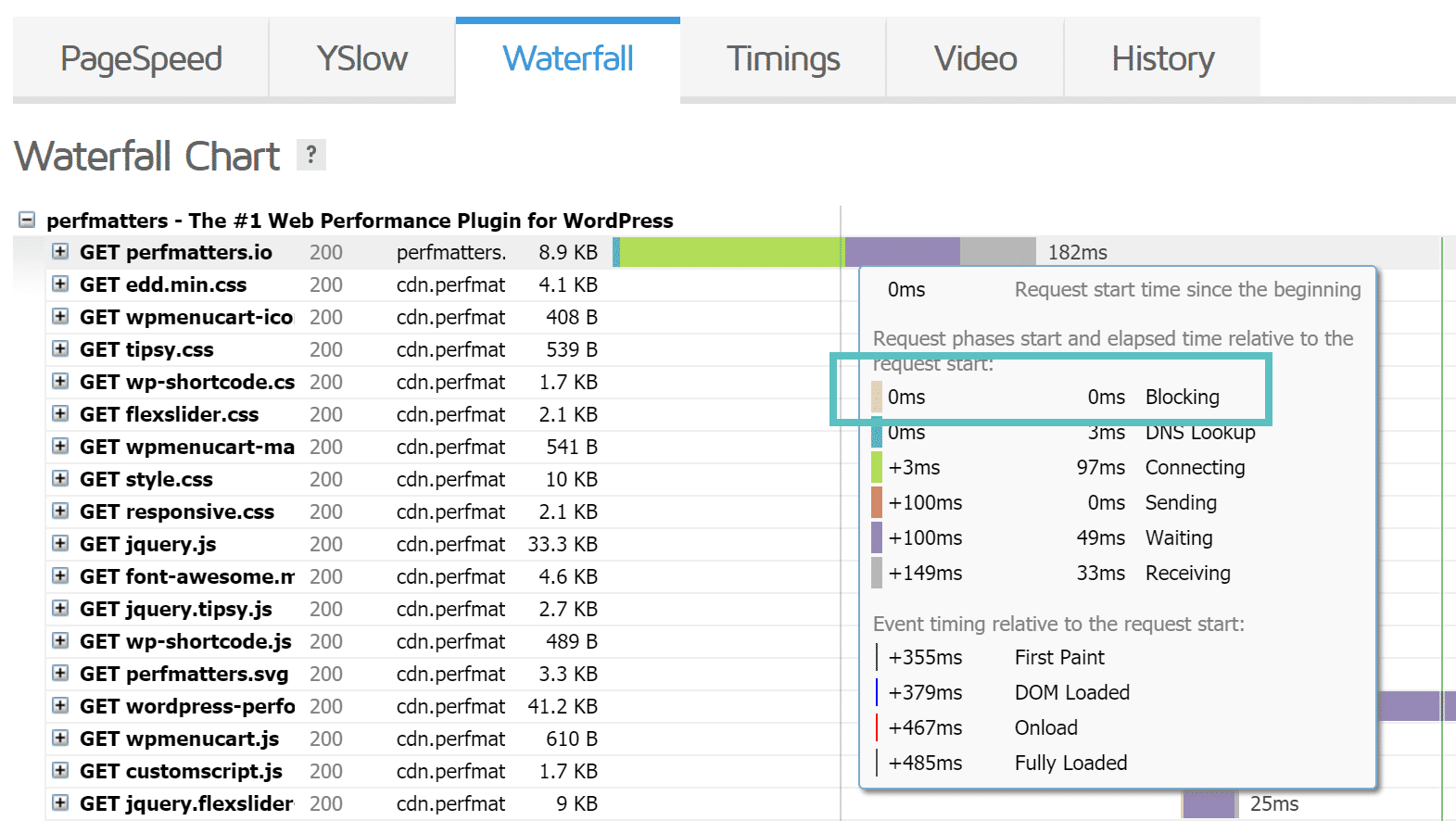 El gráfico de cascada de GTmetrix herramienta de test de velocidad muestra todas las solicitudes individuales en su página web (como se muestra abajo). A continuación, puede analizar cada solicitud para ver qué está causando retrasos y problemas de rendimiento en su sitio. Debajo está un resumen más en profundidad y/o definición para ver qué significa cada uno de los colores en cada solicitud.