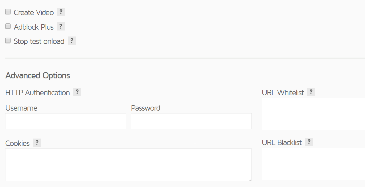 Las opciones adicionales incluyen la posibilidad de crear un video. Esto puede ayudarle a depurar problemas ya que se puede ver cómo funciona la página. El Adblock Plus es una característica agradable. Si está ejecutando una red de anuncios de terceros, como Google Adsense, puede activar esta opción para ver el impacto total de anuncios sobre sus tiempos de carga.