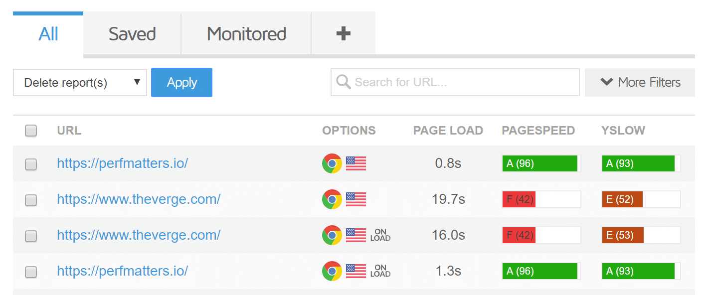 Bajo la ficha Historial puede ver todas las últimas pruebas de velocidad. Hay un límite de cuántas están guardadas en las cuentas gratuitas. También puede supervisar una URL que le permite realizar un seguimiento del rendimiento a lo largo del tiempo y ver los cambios cuando se produzcan.