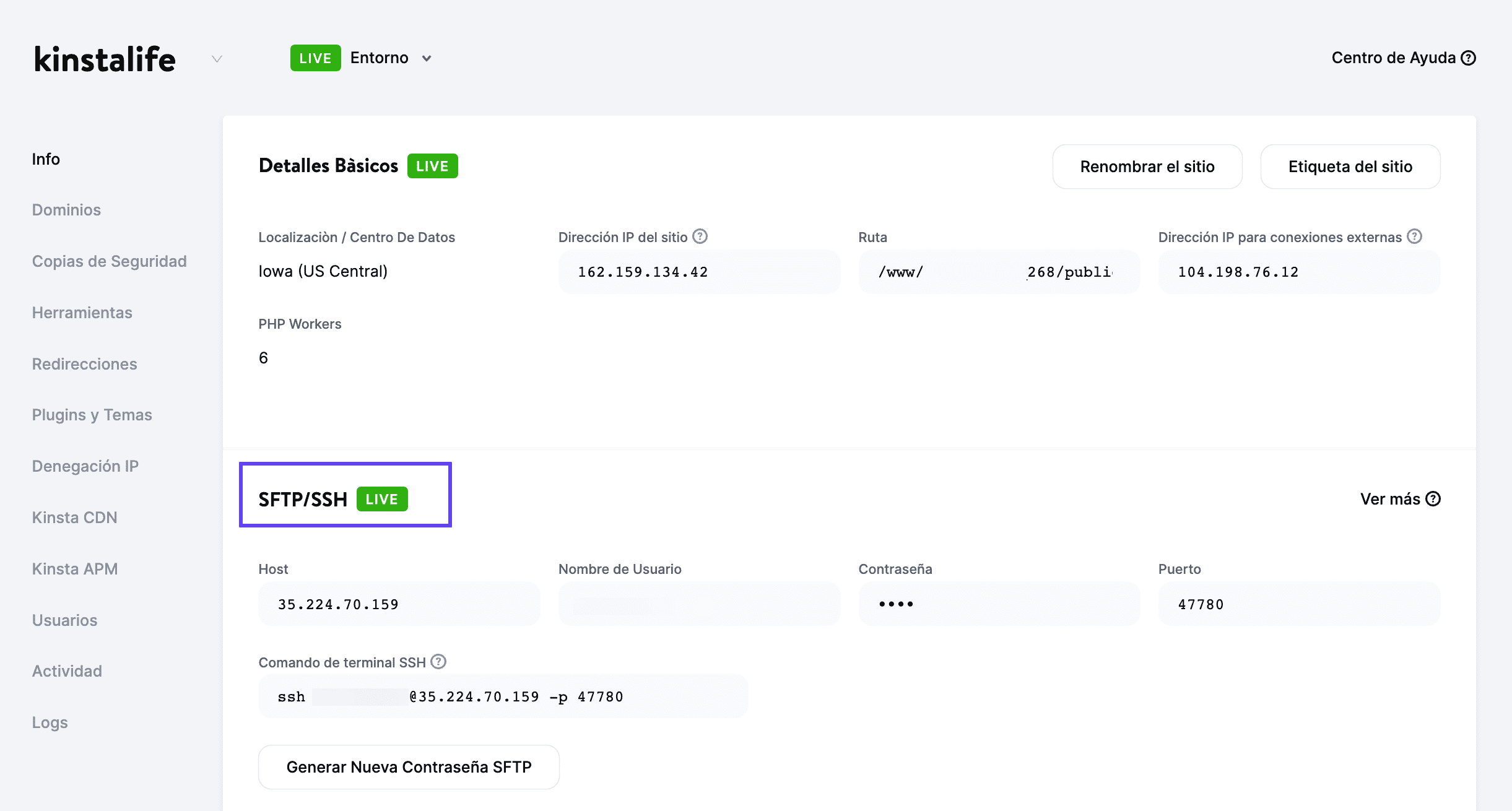 En la página de información de tu sitio web, busca la sección SFTP/SSH. Esto te dará tu nombre de usuario, contraseña, nombre de host y número de puerto. Asegúrate de mantener esta pestaña abierta para poder copiar y pegar fácilmente esta información más tarde: