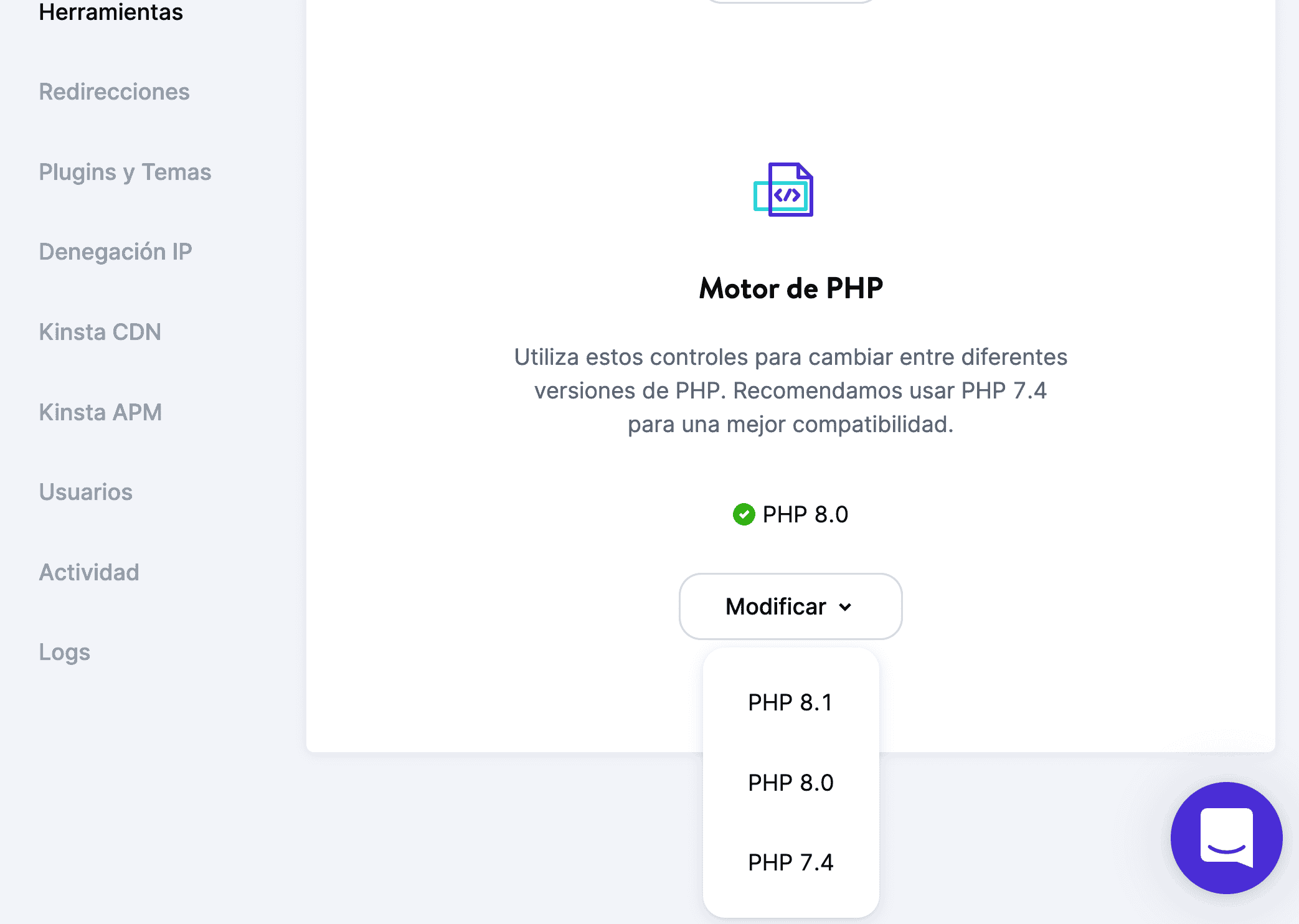 Con Kinsta, puedes cambiar fácilmente las versiones de PHP desde el panel de control de MyKinsta: