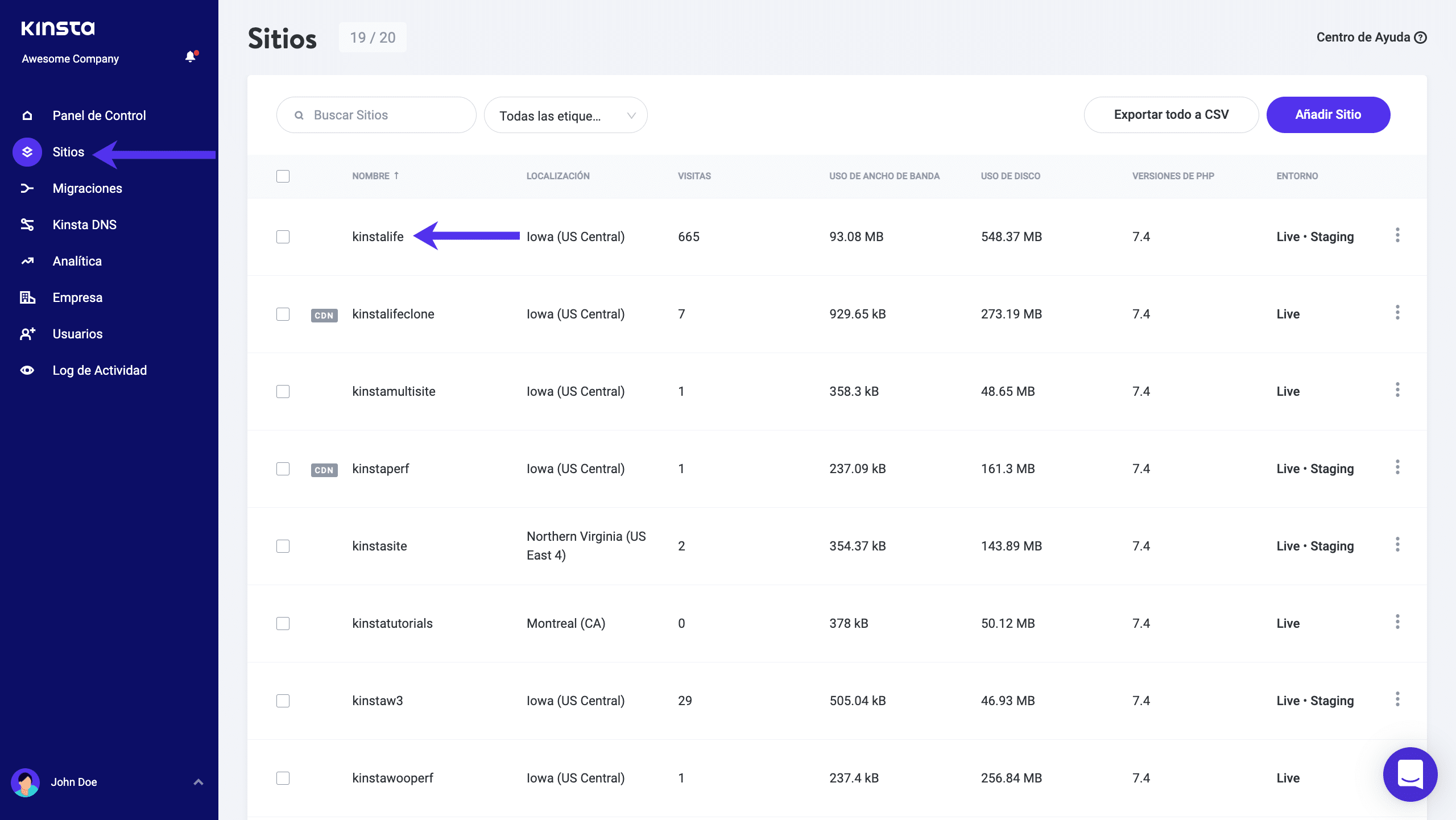 Primero, ingrese al dashboard de MyKinsta. Vaya a “Sitios” en el lado izquierdo y de clic en el sitio de WordPress del cual necesita restaurar un respaldo.