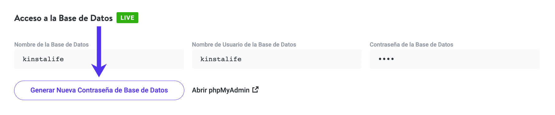 Primero, usted necesitará ingresar a phpMyAdmin. En Kinsta, tenemos un enlace fácil de acceder para llegar a su phpMyAdmin dentro del dashboard de MyKinsta. Se encuentra en la pestaña «Información» de tu sitio, en la sección «Acceso a la base de datos».