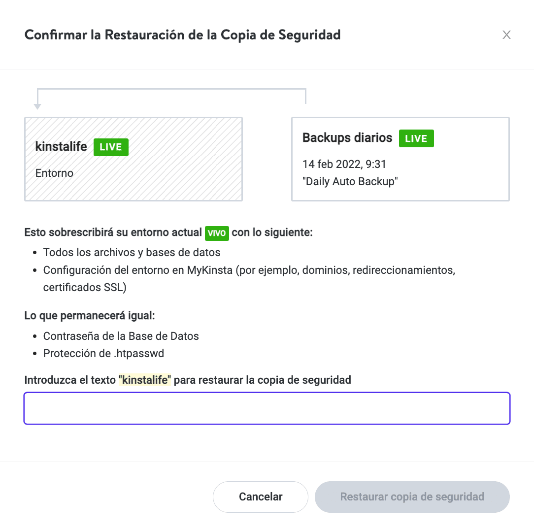 Luego tendrá una confirmación de la restauración del respaldo al ingresar el nombre de su sitio. Esto reescribirá su entorno en vivo. Luego de clic en “Restaurar.”