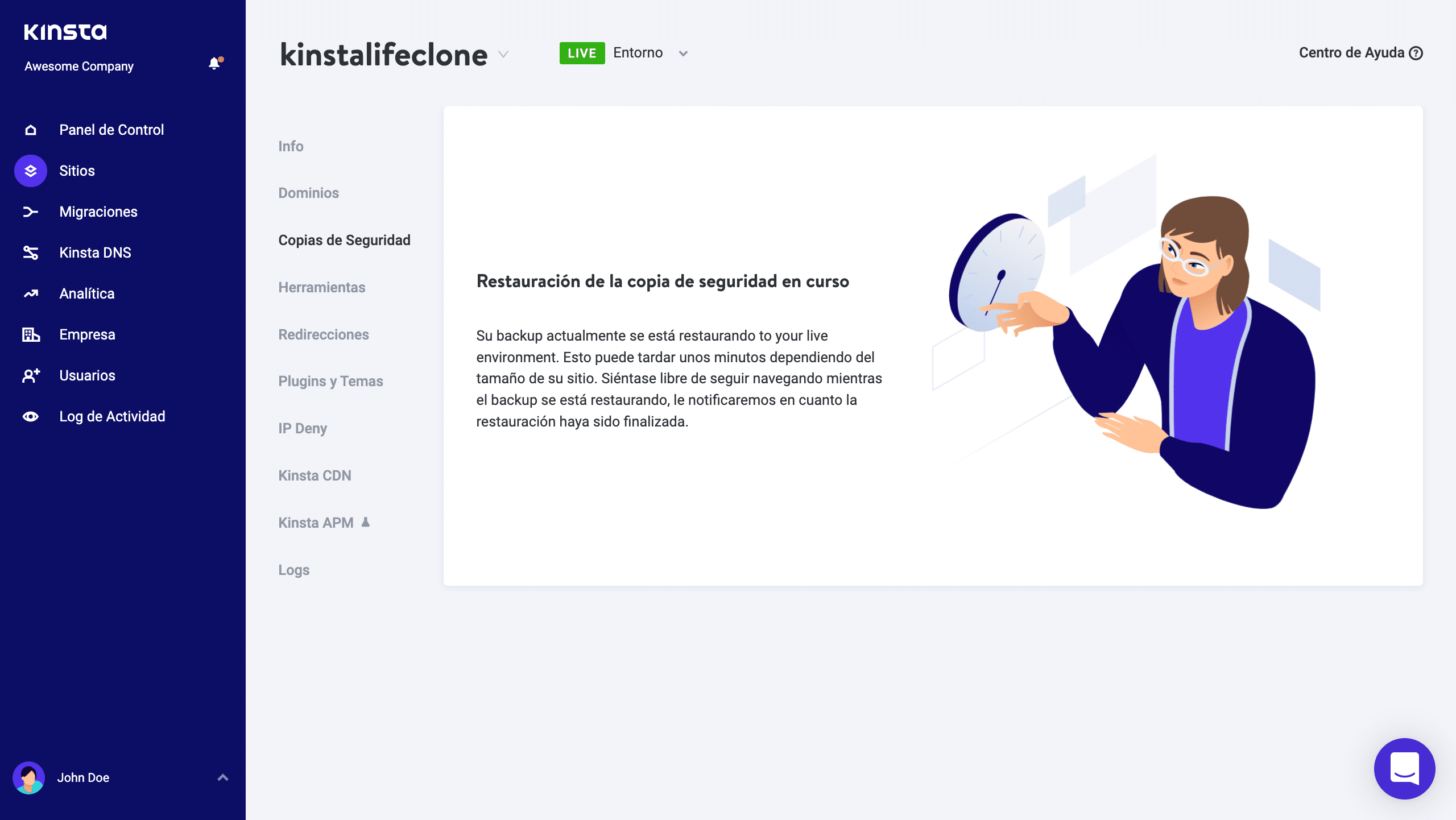 Dependiendo de que tan grande es su sitio, esto podría tomar un par de minutos. Mientras la restauración está en proceso usted no podrá tener acceso al dashboard de admin de su sitio. Usted puede salir de esta pantalla en el dashboard de MyKinsta ya que usted será notificado tan pronto una restauración esté completa.