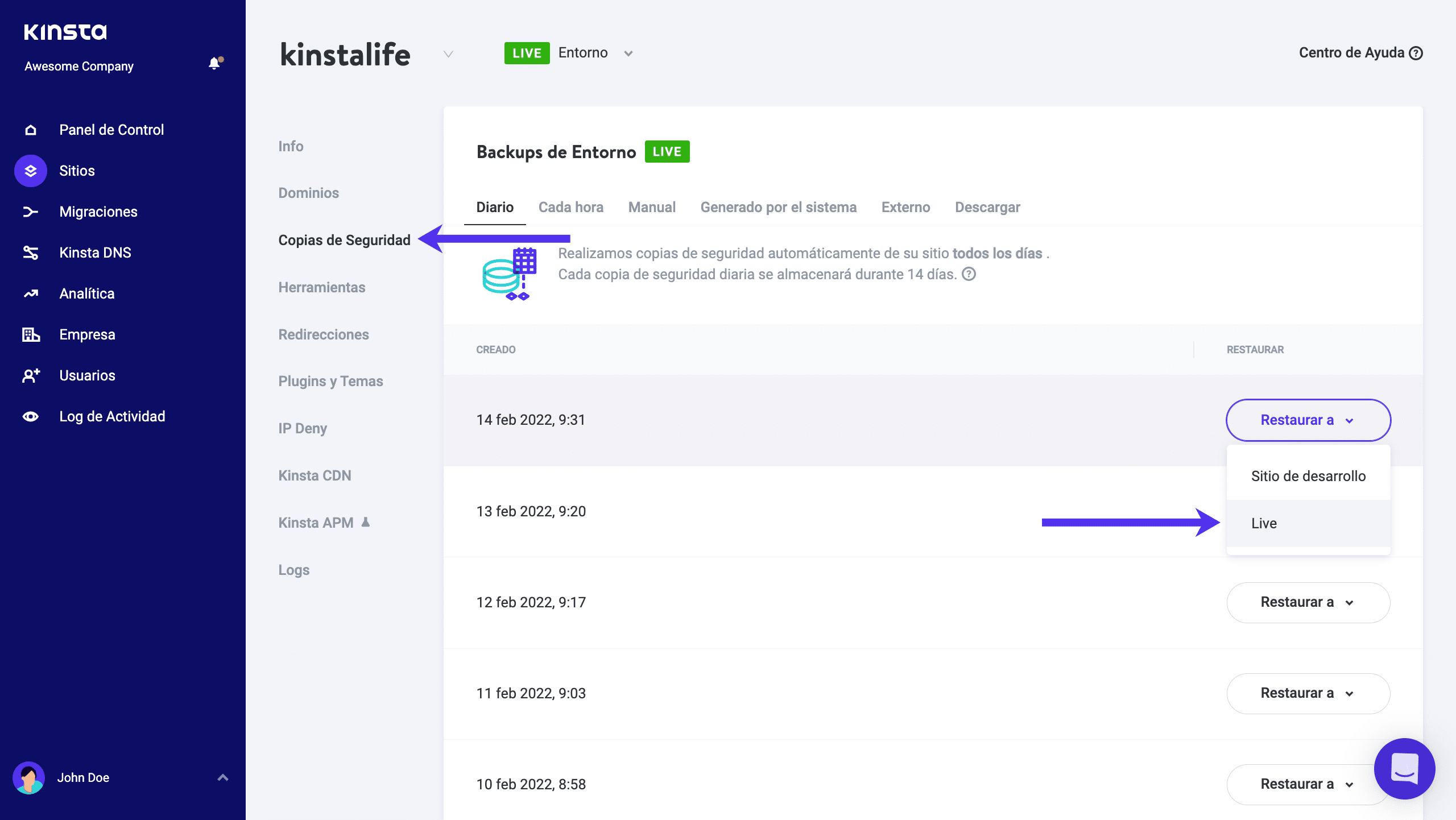 Para restaurar un respaldo simplemente de clic en el botón de “Restaurar a” a un lado del respaldo que quiera restaurar. Elegir la opción de “Vivo” reescribirá su sitio de producción.