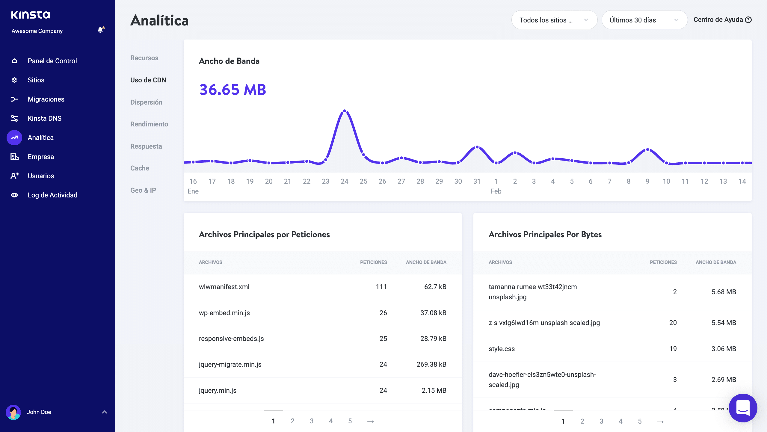 Puede conseguir los datos de las últimas 24 horas, 7 días, y 30 días. La sección de arriba, muestra el ancho de banda usado por la CDN de Kinsta. Abajo, podrá ver los archivos más importantes por petición y los que son por bytes. Si cierto archivo multimedia de su sitio está usando todo el ancho de banda de CDN, usted podrá encontrarlo en segundos.