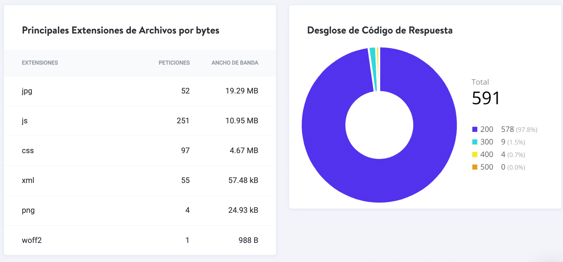 Puede ver las extensiones de archivo más usadas por bytes. Esto hace que sea sencillo poder ver qué tipo de archivo multimedia en su sitio, es el responsable por el uso de la mayoría del uso del ancho de banda. También le damos un desglose del código de respuesta.