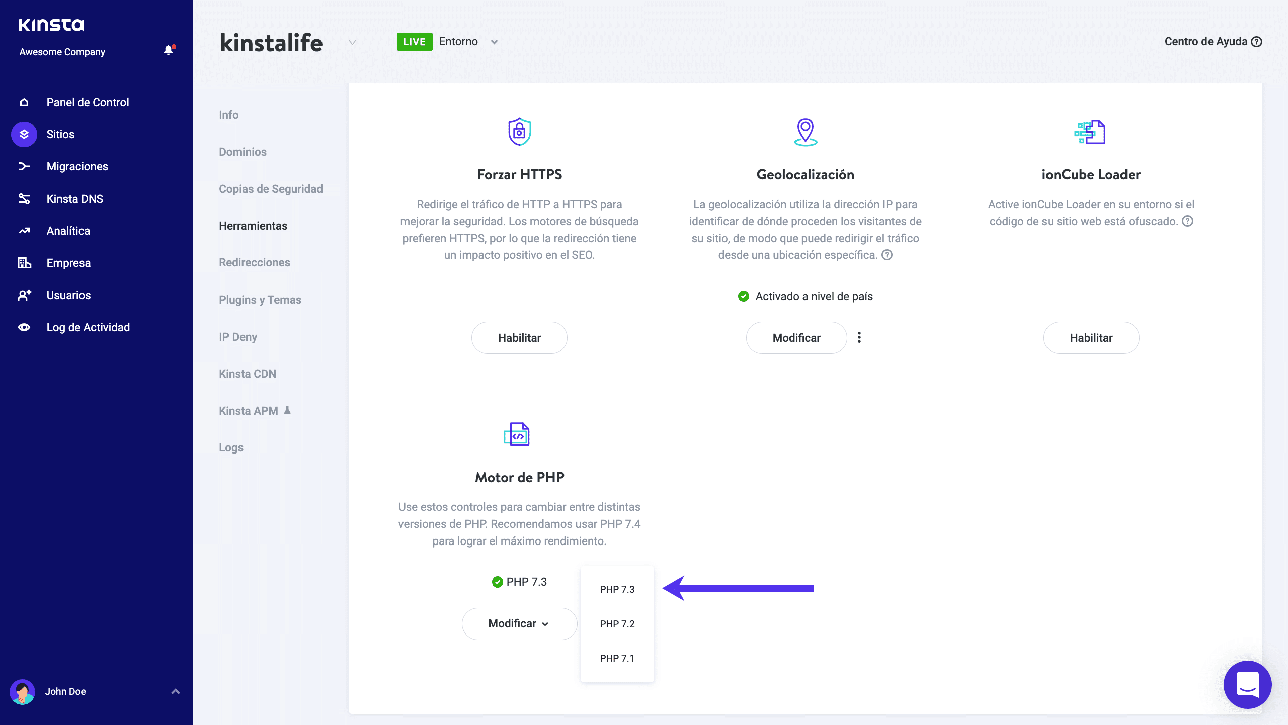 No se olvide: puede cambiar su versión de PHP con unos clic en MyKinsta.