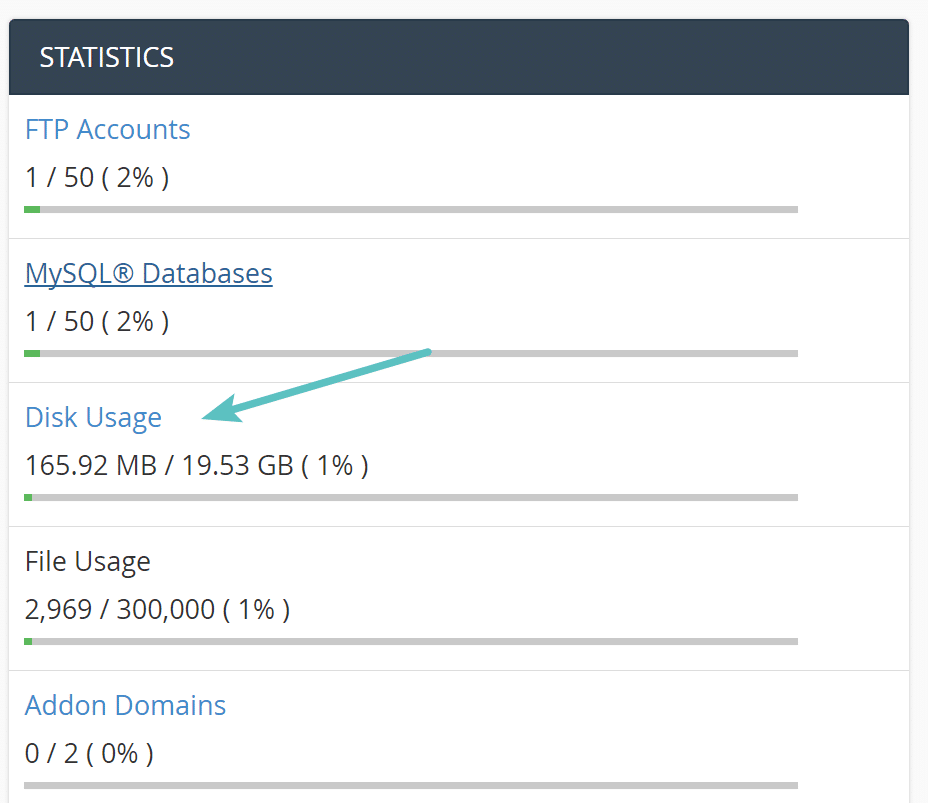 Si tu host utiliza cPanel, puedes fácilmente ver un resumen de su uso total del disco y la base de datos MySQL en la barra lateral.