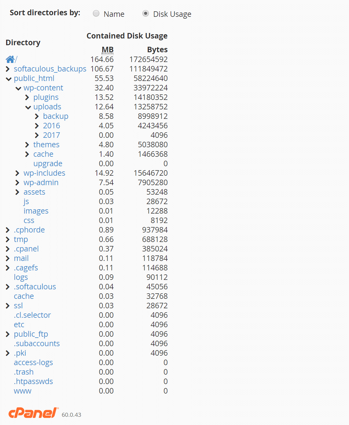 Otra forma de controlar el uso del disco granular actual y el tamaño de la base de datos es preguntarle a tu host que te proporcione un informe. Muchas veces el proveedor de alojamiento puede ejecutar rápidamente los comandos del servidor para generar un árbol/informe granular sobre directorios para mostrarle lo que está ocupando la mayor parte del espacio. Quizás no siempre sea el más bonito informe, pero le dará la información que necesita. Un host debe ser siempre feliz de ayudarle a encontrar maneras de limpiar los datos no utilizados, esto es beneficioso para ambos.