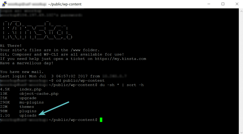 La última y definitiva forma de analizar el uso del disco es vía SSH. Mientras que este es probablemente sería para las personas más sabias en cuanto a tecnología, pensamos que aún así lo incluiríamos, ya que es bastante fácil de hacer. Simplemente conéctate a tu host vía SSH. A continuación, utilice los siguientes comandos. El primero le llevará a tu carpeta wp-content usando el comando de cambiar directorio (cd). Nota: Esta ubicación puede variar en ciertos hosts.