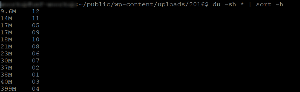 Puedes ir tan profundo como sea necesario (usando los mismos comandos) hasta que encuentres lo que está ocupando más espacio en tu sitio. En este caso, es nuestra carpeta Uploads.