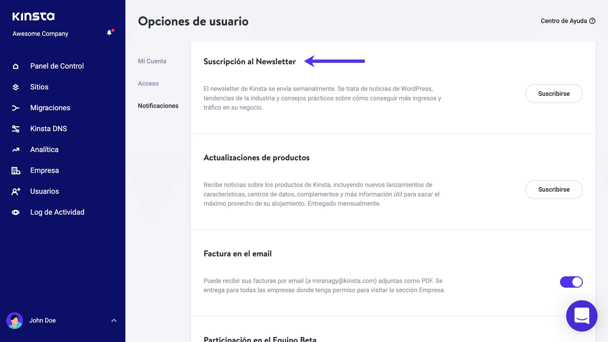 Ahora hemos integrado la suscripción al boletín en el panel de control de MyKinsta. Puede suscribirse y darse de baja fácilmente, o incluso cambiar el idioma. Para acceder a esto, haga clic en su avatar en la parte inferior izquierda y luego en «Configuración de usuario». A continuación, puede desplazarse hacia abajo hasta la sección «Suscripción al boletín de noticias».