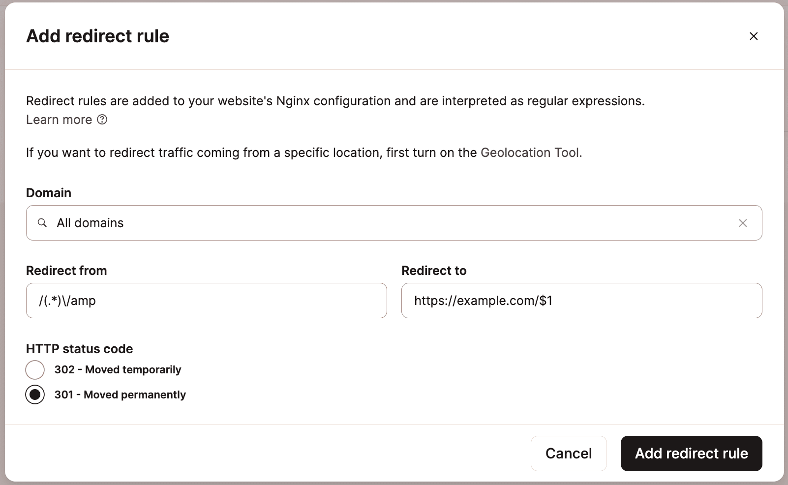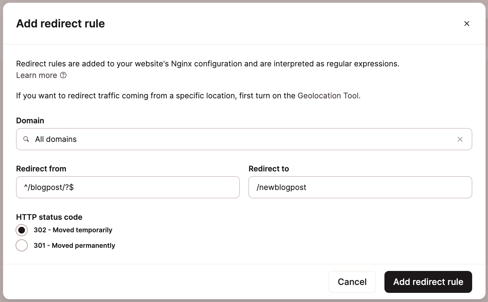 302,domain.com,^/oldpath/?$,https://newlocation.com/newpath,AL,Albania,Ballsh