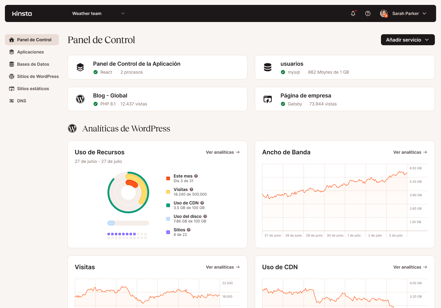 MyKinsta es nuestro panel de gestión del sitio desarrollado a medida. Hace que las tareas de administración del sitio sean fáciles para ti, o para cualquier persona de tu equipo, independientemente de sus conocimientos técnicos. Además, tiene todas las herramientas avanzadas utilizadas por los desarrolladores en un solo lugar. Todo el panel de MyKinsta está disponible en español.