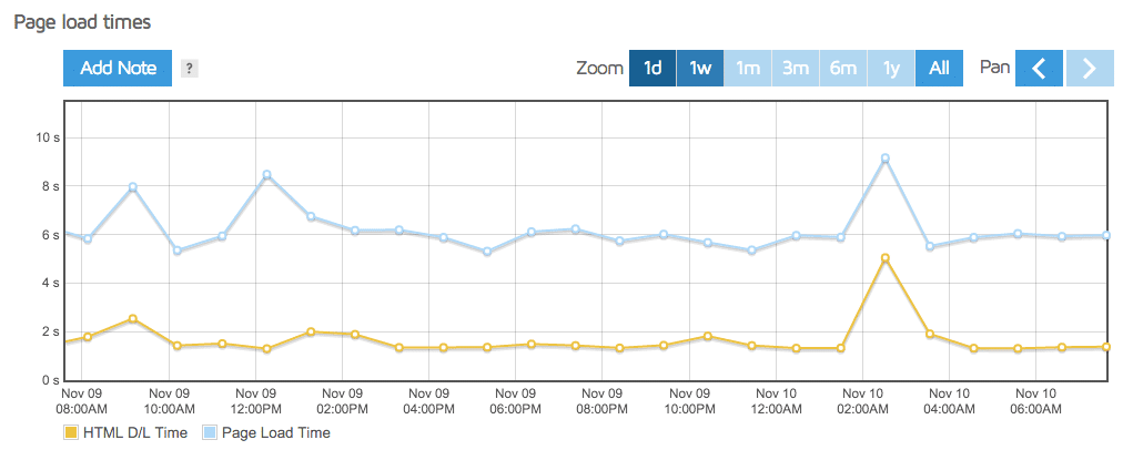 Ironiquement, New Relic peut aussi causer des problèmes de performance. Dans ce cas, nous vous recommandons de l’utiliser pour le dépannage et la surveillance sporadiquement, et pas pour une utilisation continue. Vous pouvez également utiliser un outil comme GTMetrix pour programmer des contrôles horaires de vitesse sur votre site. Après quelques jours, vous pouvez vérifier et voir les résultats dans un joli petit graphique :