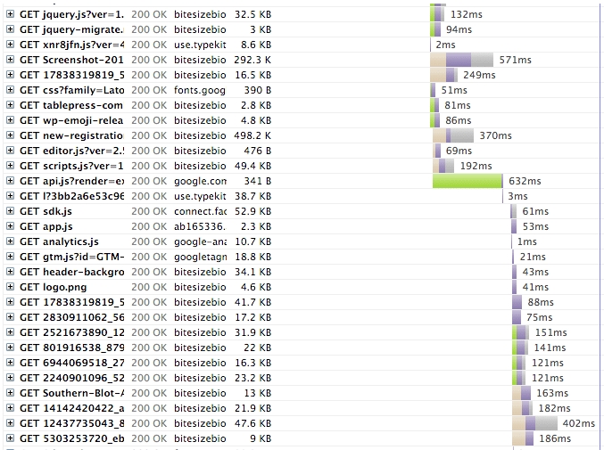 La prochaine chose à regarder est la boîte Facebook qui cause toutes ces requêtes statiques.xx.fbcdn.net et scontent.xx.fbcdn.net. Nous pouvons voir que les barres sont assez courtes, ce qui signifie qu’elles ne causent pas beaucoup de retard. Cependant, une fois que vous les additionnez tous ensemble, et c’est là que le problème se pose. Encore une fois, il s’agit d’un problème de volume.