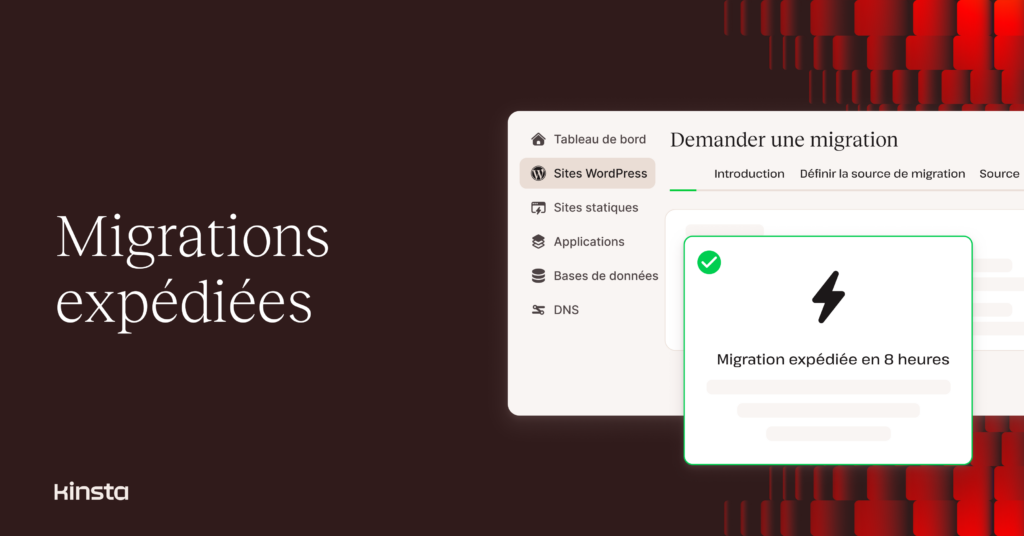 Moyennant des frais (49 USD), vous pouvez désormais demander une migration accélérée. Nous transférerons votre site vers la plateforme d’hébergement WordPress infogéré de Kinsta dans les huit heures ou nous vous rembourserons ces frais.