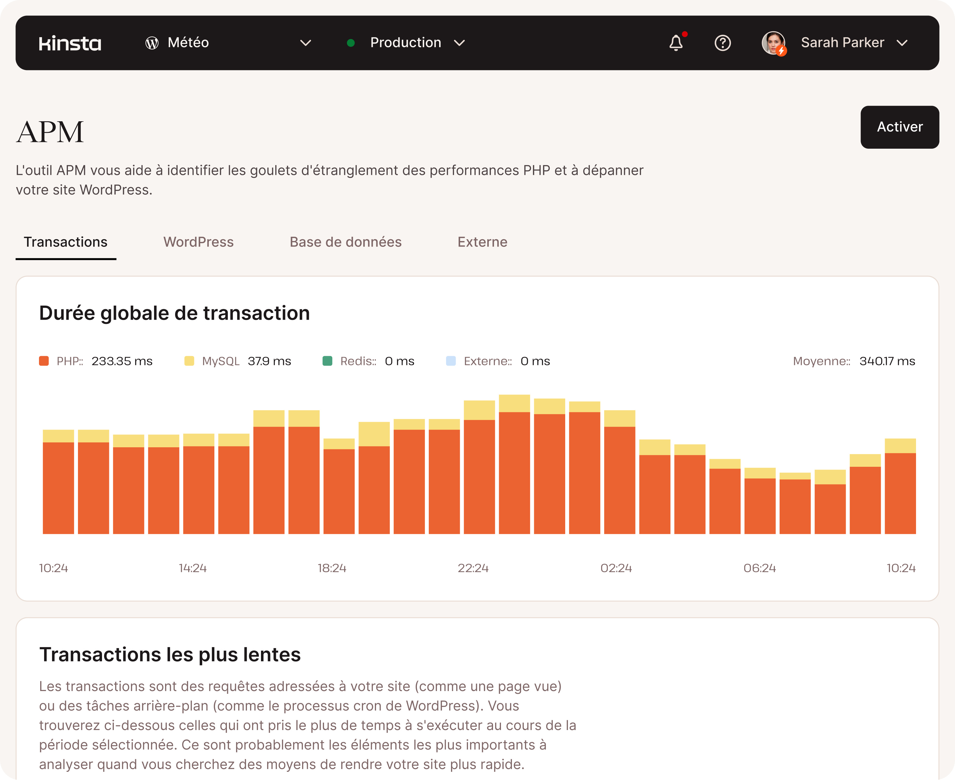Avec notre tableau de bord MyKinsta, vous pouvez créer de nouveaux sites, gérer les domaines et les DNS, accéder aux sauvegardes, et analyser le trafic du site, l’utilisation de la bande passante, les mesures de performance, et plus encore.