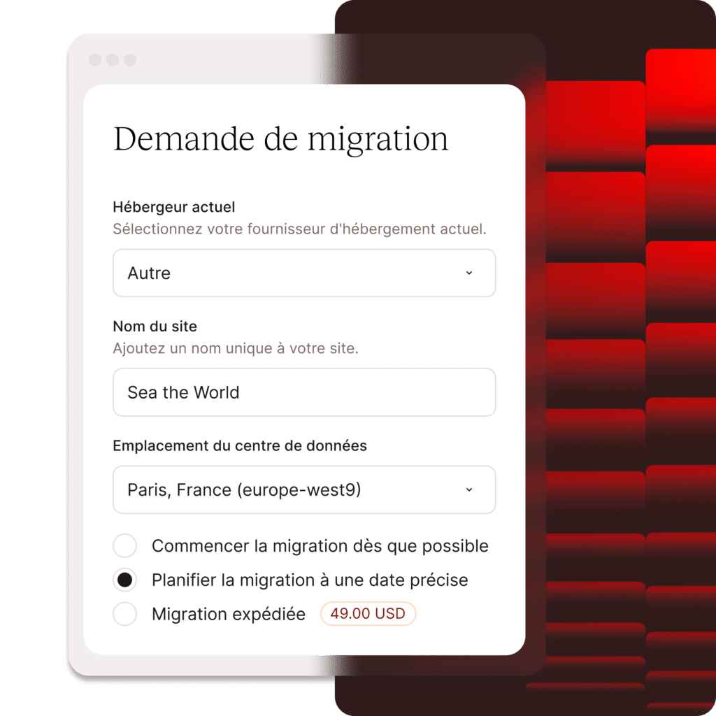 Tous nos plans incluent un nombre illimité de migrations gratuites. Nous utilisons des scripts et SSH pour garantir qu’aucune donnée n’est perdue et qu’il y a une interruption minimale de votre site. Les migrations sont effectuées en semaine.