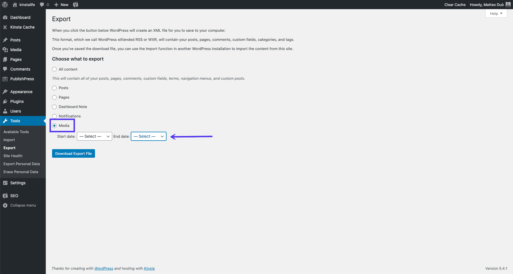 In alcune circostanze, potrebbe essere necessario scaricare i file dalla Libreria Media sul vostro computer. WordPress consente di farlo nativamente navigando su Strumenti > Esporta: