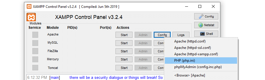 In alternativa, se state usando XAMPP per Windows, potete accedere a questo file dal pannello di controllo facendo clic su Config > PHP (php.ini):
