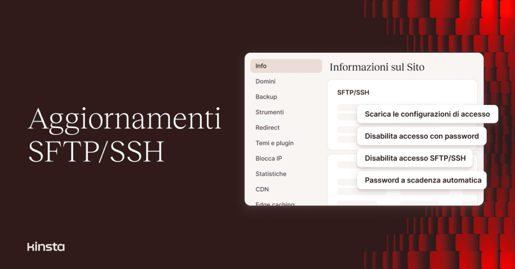 Abbiamo migliorato le opzioni di configurazione del protocollo di trasferimento sicuro dei file (SFTP) e di secure shell (SSH) all’interno della dashboard di MyKinsta per dare ai clienti dell’Hosting WordPress gestito un maggiore controllo sulla sicurezza del sito.