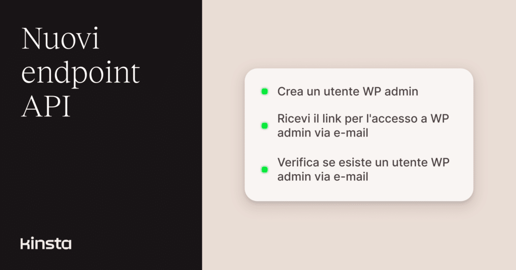 Questi nuovi endpoint estendono la funzione di login automatico a WP Admin oltre a MyKinsta, fino all’API di Kinsta.