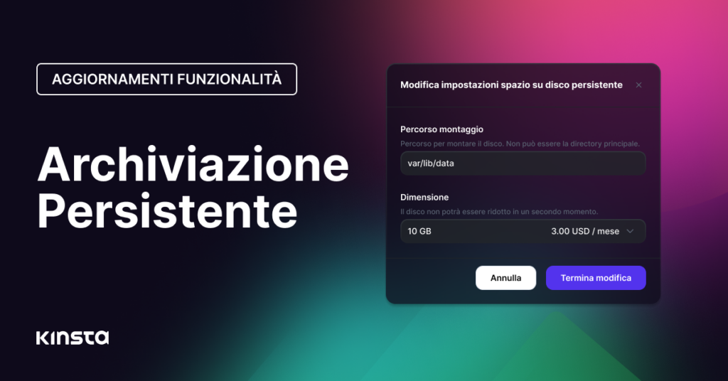 I clienti che utilizzano l’Hosting di Applicazioni di Kinsta hanno un’altra opzione per l’archiviazione persistente dei dati. Ora possono aggiungere spazio su disco virtuale ai propri progetti.
