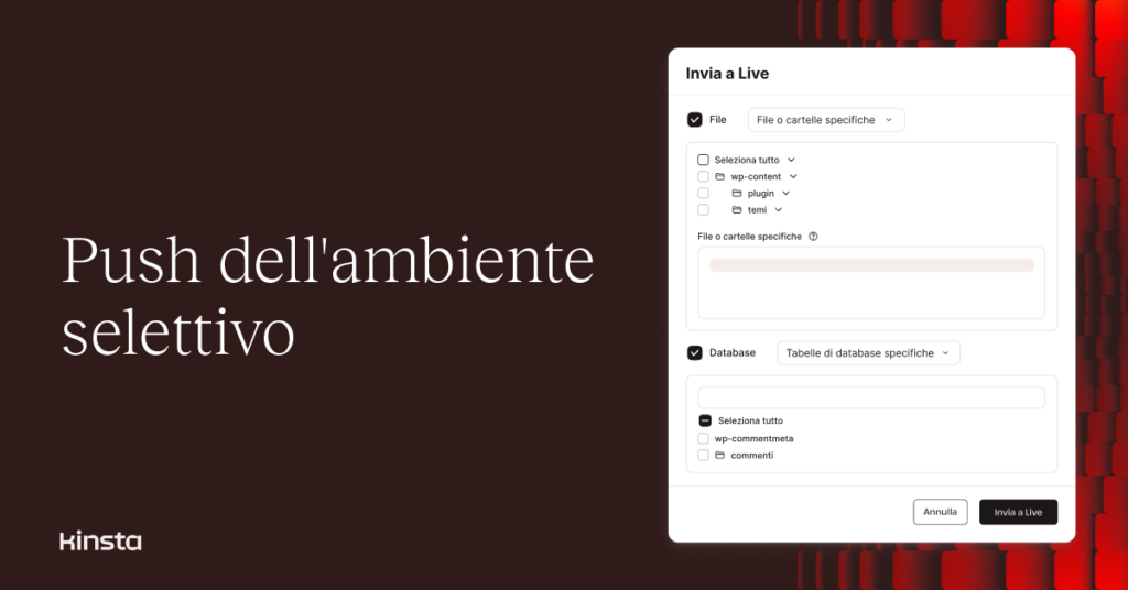 Grazie alla nuova funzionalità di push selettivo, i clienti possono ora distribuire qualsiasi cosa, da interi siti a singoli file o tabelle di database dallo staging, consentendo a MyKinsta di supportare un maggior numero di flussi di lavoro di sviluppo.