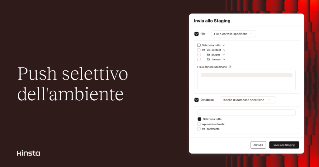 Abbiamo migliorato la funzionalità Push Selettivo nella dashboard di MyKinsta per supportare la distribuzione di file, cartelle e tabelle di database da siti web WordPress live ad ambienti di staging.