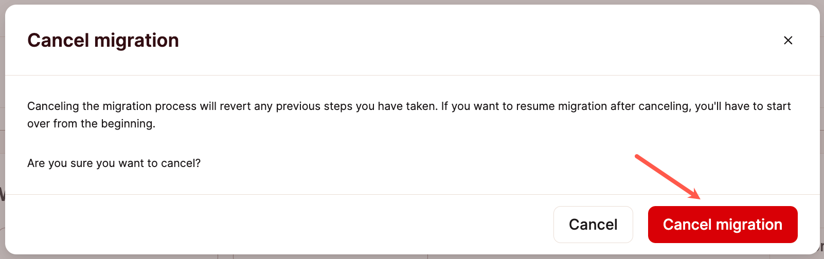 Nella finestra modale/pop-up che appare, clicca su Annulla migrazione per confermare che l’annullamento di questa migrazione ripristinerà tutti i passaggi precedenti. Se vuoi riprendere la migrazione dopo l’annullamento, dovrai avviare una nuova richiesta di migrazione dall’inizio.