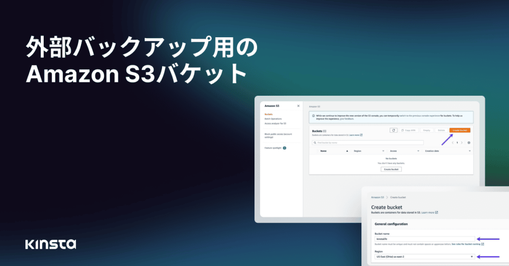Kinstaの外部バックアップアドオンを使用すると、WordPressサイトをAmazon S3またはGoogle Cloud Storageにバックアップすることができます。この記事では、Amazon S3バケットのセットアップと設定方法をご紹介します。Google Cloud Storageバケットを使用したい場合はこちらをご覧ください。