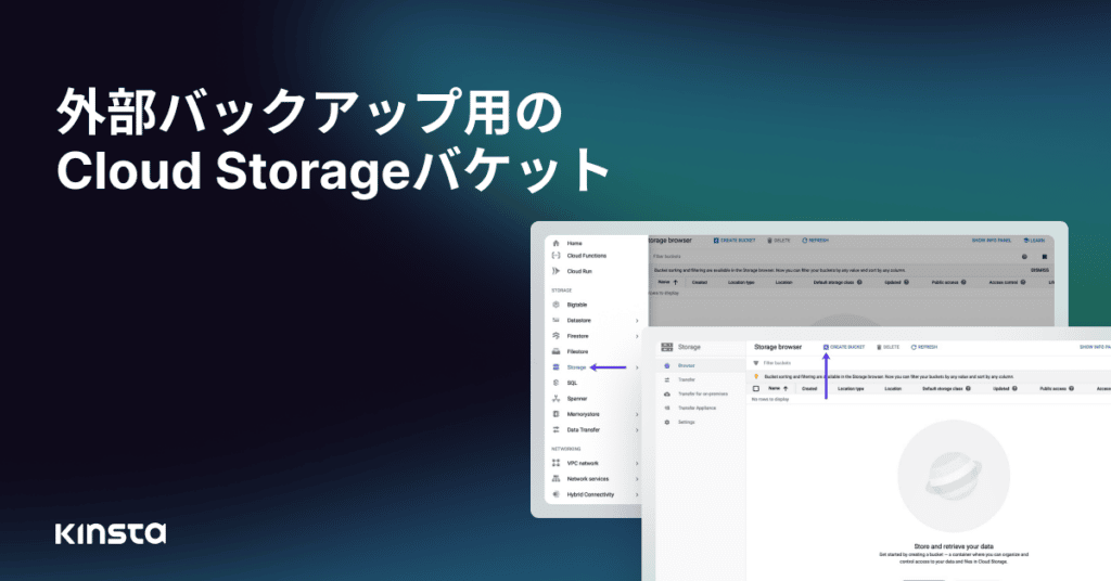 Kinstaの外部バックアップアドオンを使用すると、Amazon S3またはGoogle Cloud Storageを使い、WordPressサイトのバックアップを取ることができます。この記事では、Google Cloud Storage(GCS)バケットのセットアップ方法をご紹介します。Amazon S3バケットの使用についてはこちらをご覧ください。