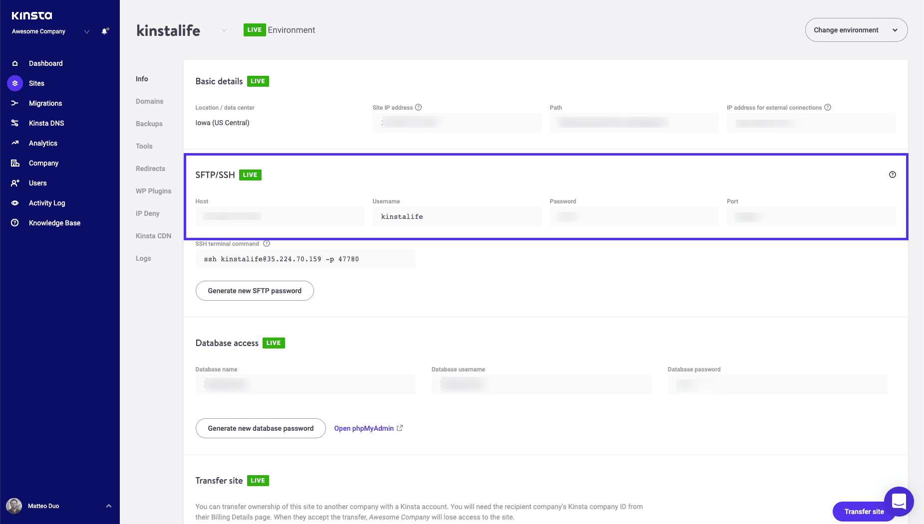 Kinsta klanten kunnen hun gegevens meteen in MyKinsta vinden door naar Sites te gaan, op het relevante domein te klikken, en bij SFTP/SSH te kijken in het tabblad Info: