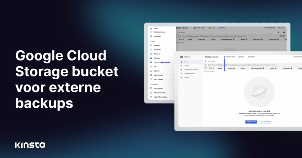Met de Externe backup add-on van Kinsta kun je een backup maken van je WordPress site en deze automatisch exporteren naar Amazon S3 of Google Cloud Storage. In dit artikel laten we je zien hoe je een Google Cloud Storage (GCS) bucket instelt en configureert. Als je een Amazon S3 bucket wilt gebruiken, volg dan de stappen in onze handleiding Een Amazon S3 bucket aanmaken en configureren.